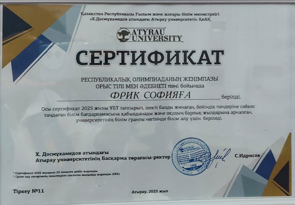 Х.Досмұхамедов атындағы Атырау университеті ректорының білім грантымен 10-11(12) сынып оқушылары арасында қоғамдық-гуманитарлық бағыттағы жалпы білім беретін пәндер бойынша республикалық олимпиаданың алтын медалі иегері Фрик София - Көкшетау қаласы, №13 "ЭКОС" мектеп-гимназиясының 11-сынып оқушысы, «Орыс тілі мен әдебиеті» пәні бойынша марапатталды.