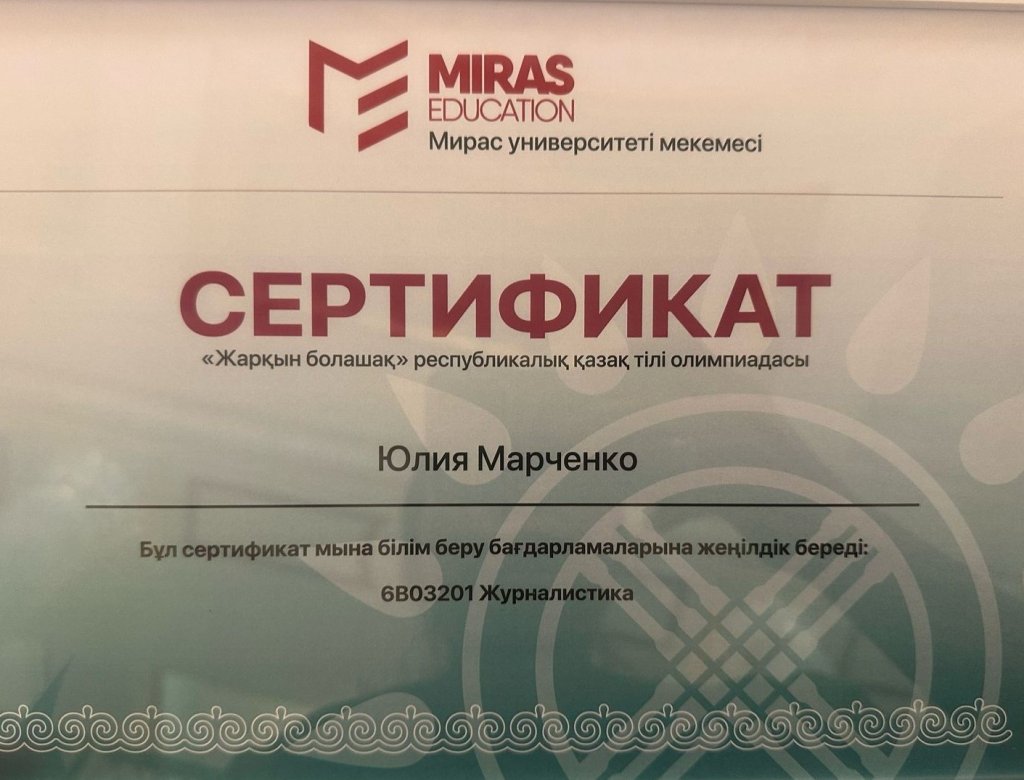 Miras education Мирас университетінің «Журналистика» (6В03201) білім беру бағдарламаларына жеңілдік сертификатымен «Бейнелеушілер» бағыты бойынша (рус.) Жақсы ауданы бойынша білім бөлімі К.Өскенбаев атындағы Қима ауылының жалпы орта білім беретін мектебінің 11-сынып оқушысы Марченко Юлия марапатталды.
