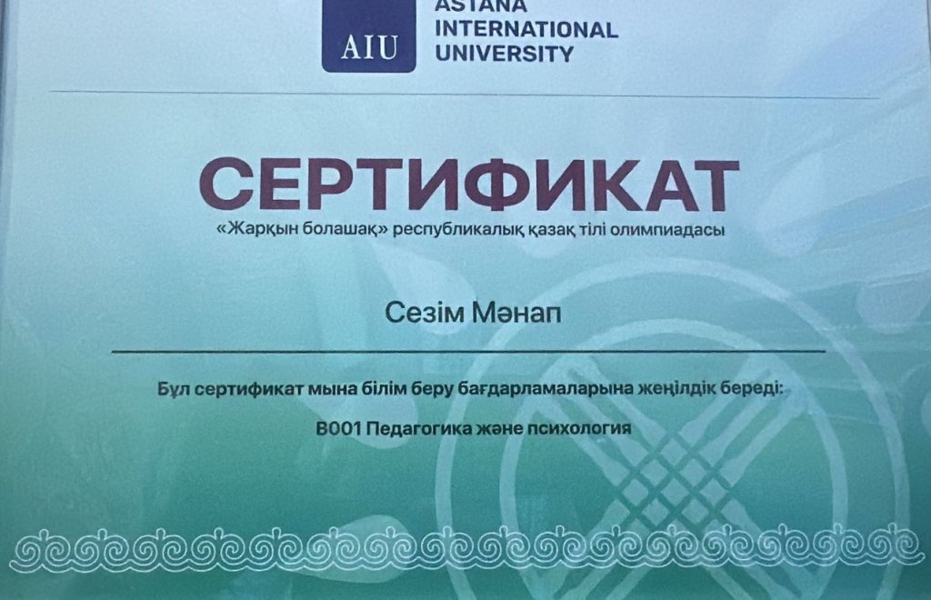 1.Astana International University университеттің «Педагогика және психология» (В001) білім беру бағдарламаларына жеңілдік сертификатымен «Сөз шеберлері» бағыты бойынша (қаз.) Көкшетау қаласы бойынша білім бөлімі Красный Яр ауылының № 3 көпсалалы мектеп-гимназиясының 11-сынып оқушысы Мәнап Сезім марапатталды.