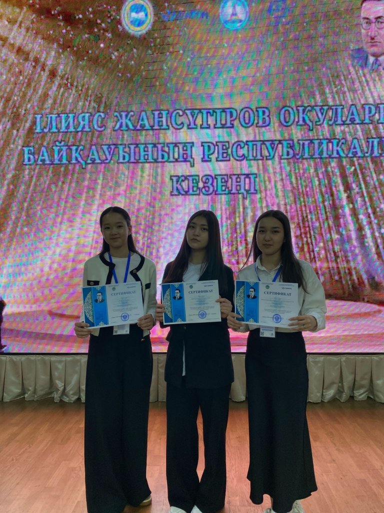 «Ілияс Жансүгіров оқулары» қорытынды кезеңіне бойынша IІ-дәрежелі дипломмен «Сұлу сөздің сүлейі»-шығарманың көркемдік құрылысын талдау номинациясы бойынша Аршалы ауданы Иманжүсіп Құтпанұлы атындағы Жібек жолы ауылының жалпы орта білім беретін мектебінің 9- сынып оқушысы Нұрланқызы Қарақат марапатталды.
